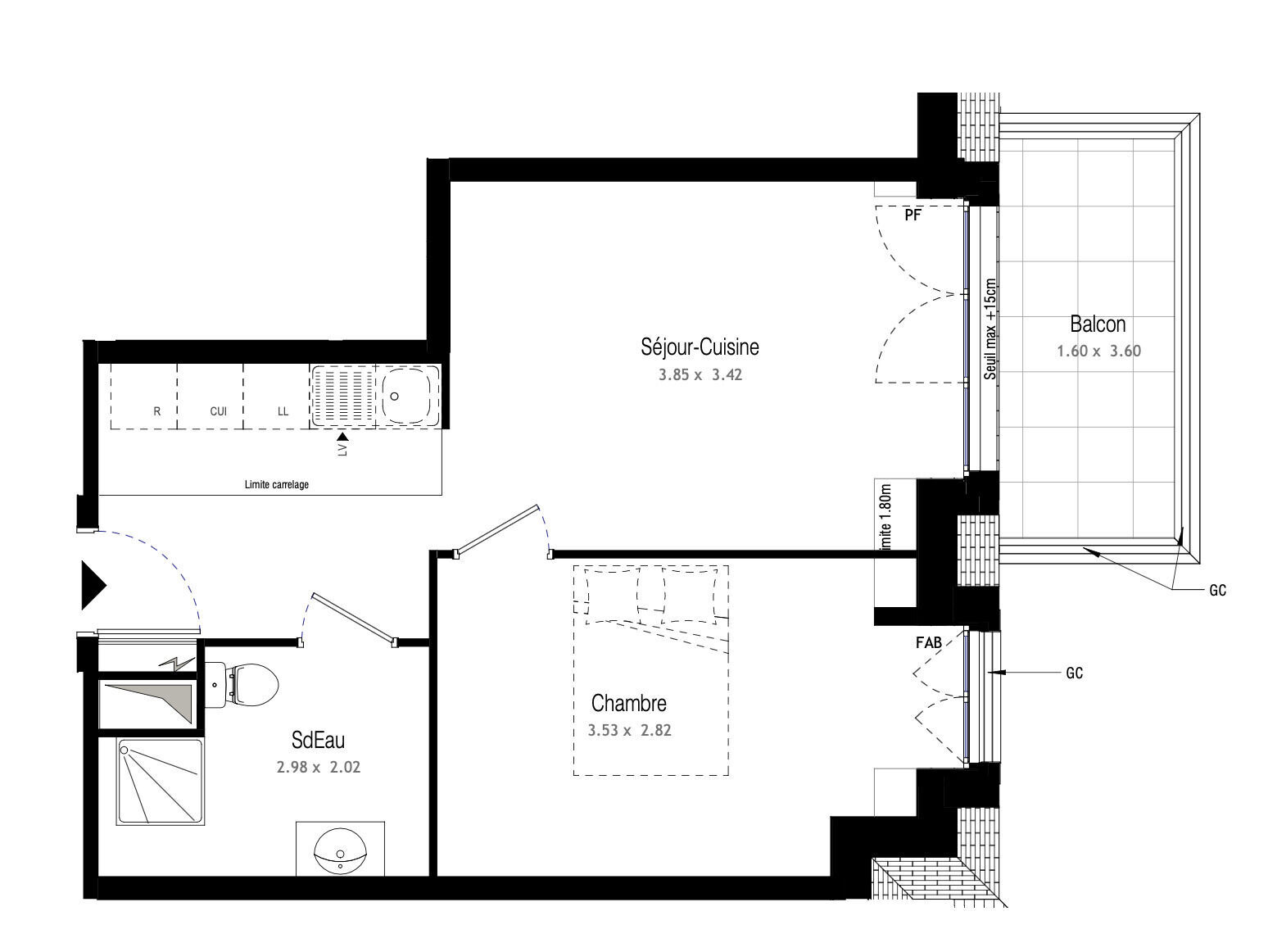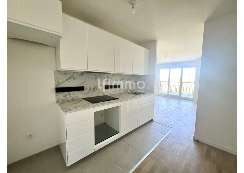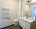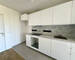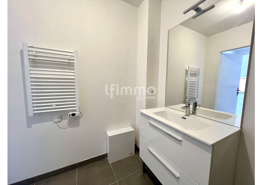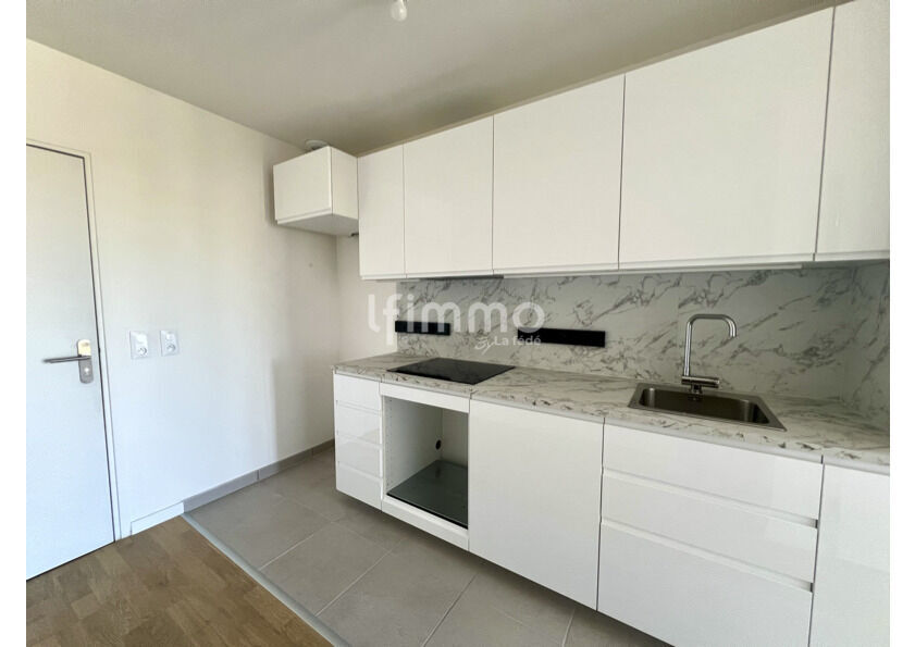 Séjour parqueté de 23m2 avec cuisine ouverte aménagée et semi-équipée (plaque induction, hotte), une chambre spacieuse de 12m2, une salle d'eau avec douche italienne, lavabo vasque avec tiroirs, miroir/luminaire, sèche-serviette et toilettes.