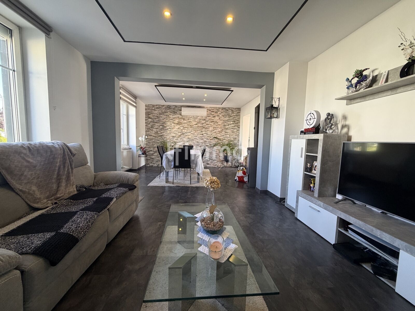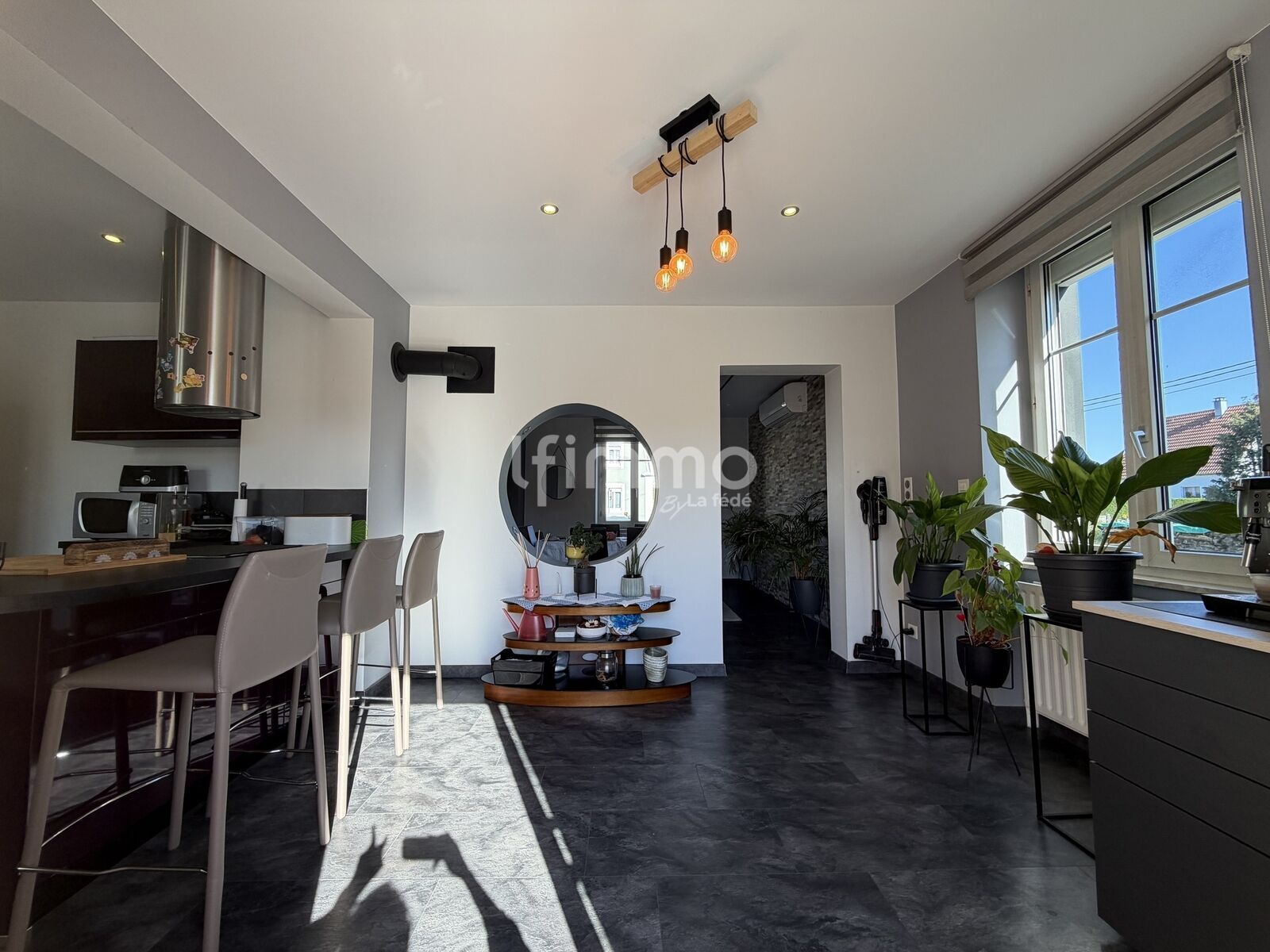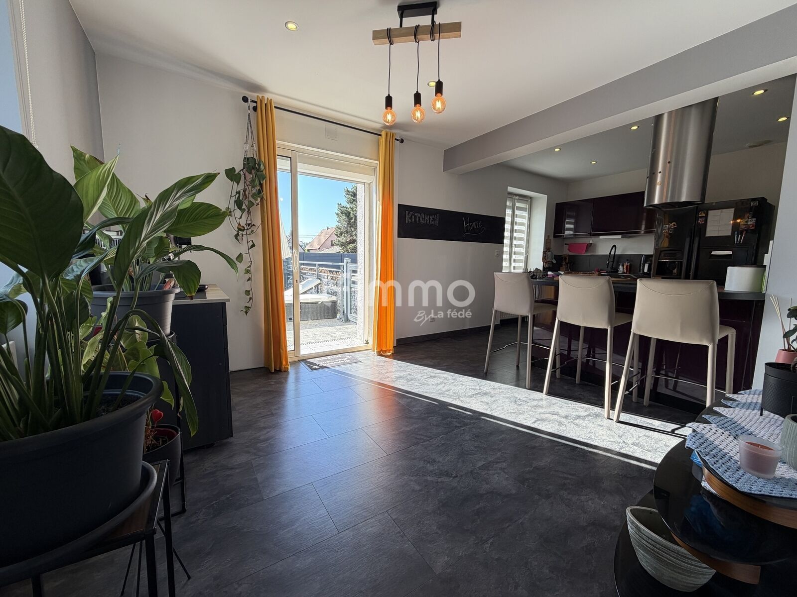 Le salon-séjour, lumineux et convivial, promet de doux moments partagés autour du poêle à bois.