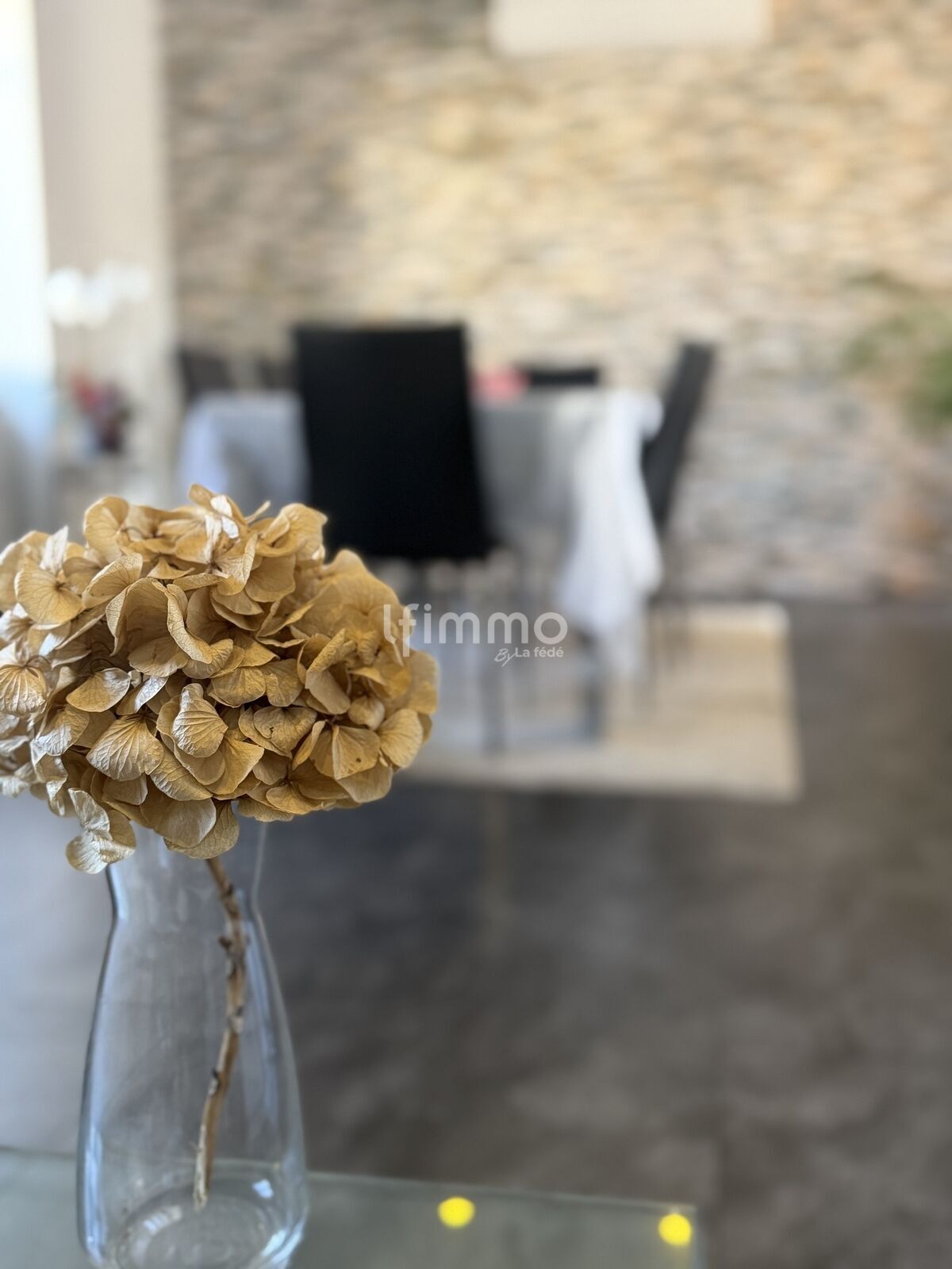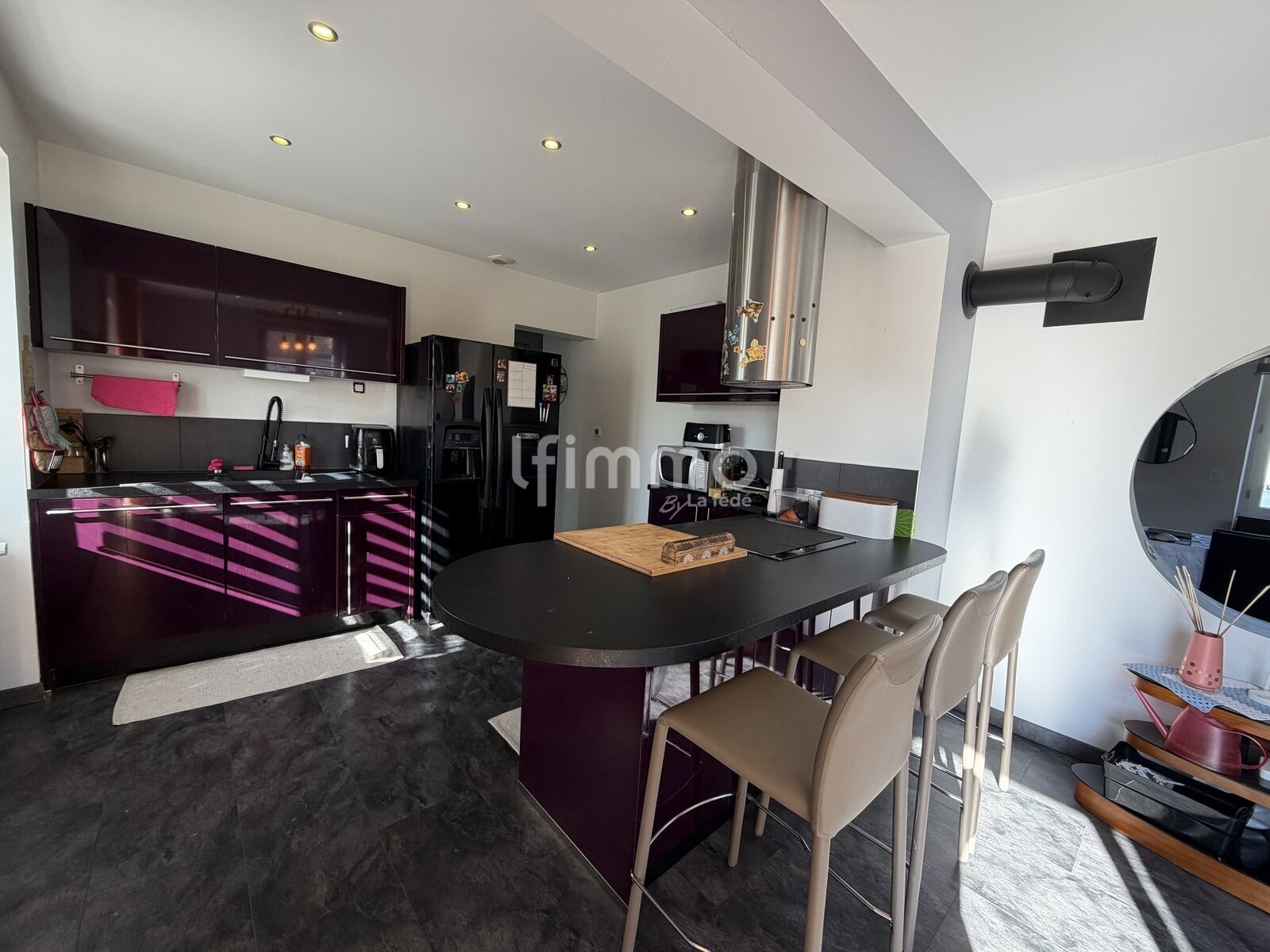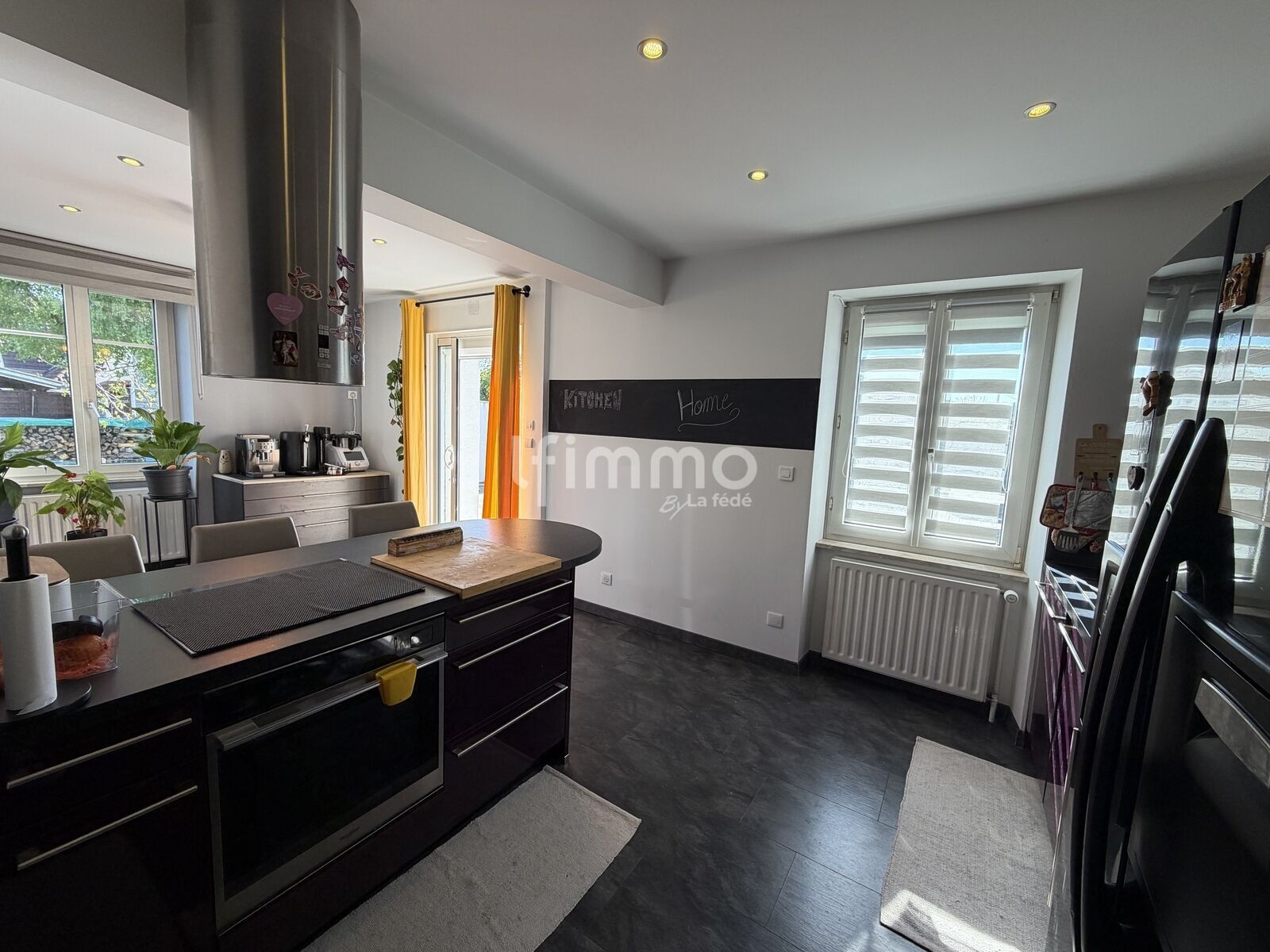 Le salon-séjour, lumineux et convivial, promet de doux moments partagés autour du poêle à bois.