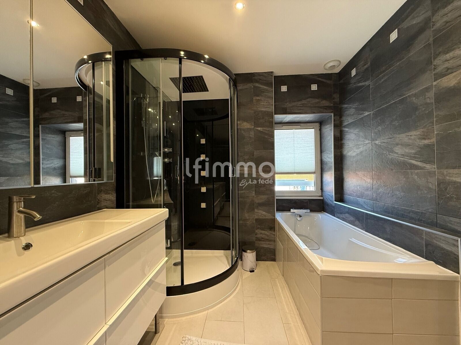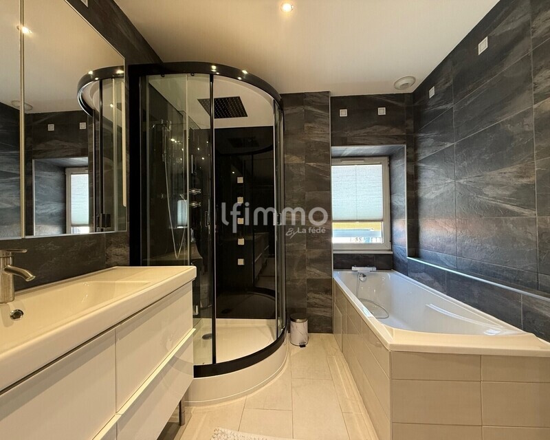 La salle de bain spacieuse propose à la fois une douche et une baignoire, ainsi qu'un grand meuble vasque accompagné de rangement pratiques. Les toilettes sont séparées et disposent d'un branchement pour machine à laver, apportant un réel confort au quotidien.